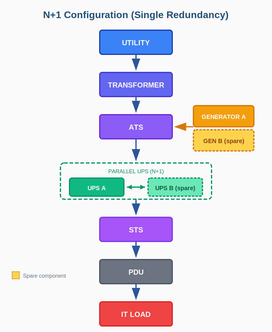 N+1 - Single redundancy. Adds one spare component (UPS module, generator) to the baseline. A single failure or planned maintenance event can be absorbed without service interruption.
