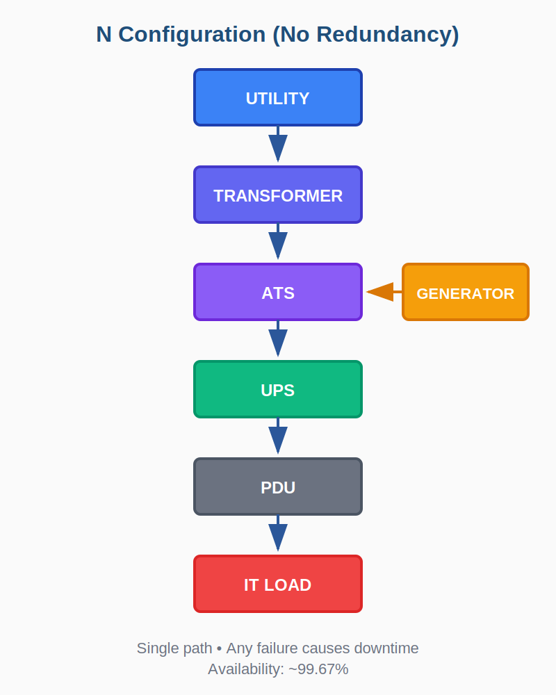 Characteristic: Single path. Any component failure interrupts service. Suitable only for non-critical loads or development environments.