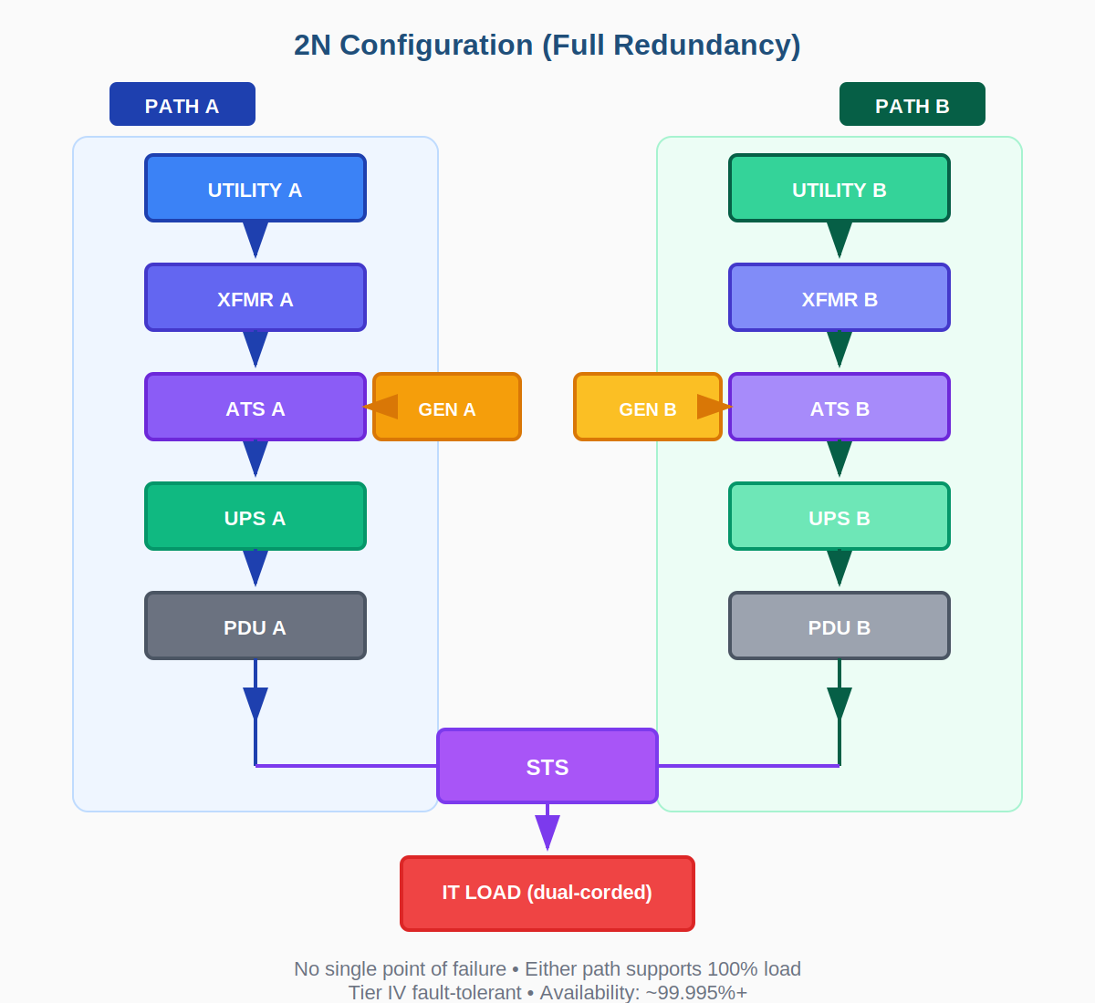 2N - Full redundancy. Two completely independent power paths, each capable of supporting 100% of the IT load. No single point of failure exists. Either path can be taken fully offline without interrupting service.